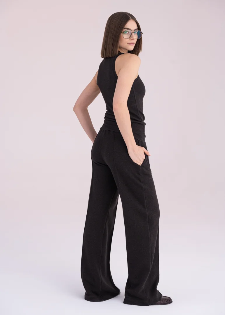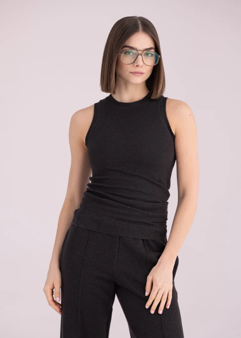 - Rib-trimmed neckline and armholes