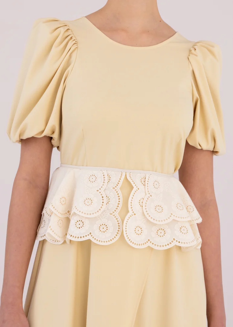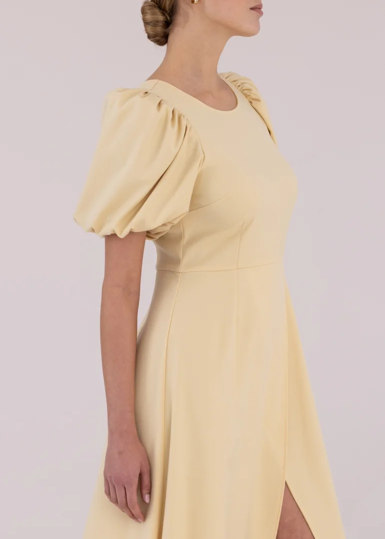- Short, puffed sleeves with elastic trim